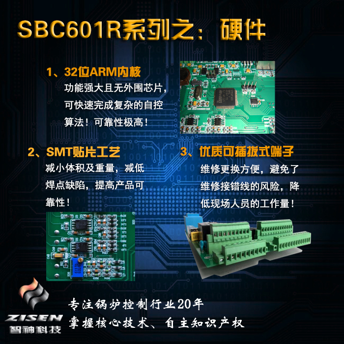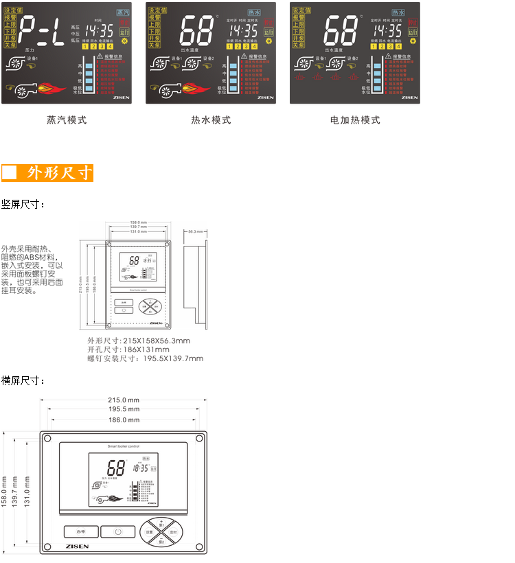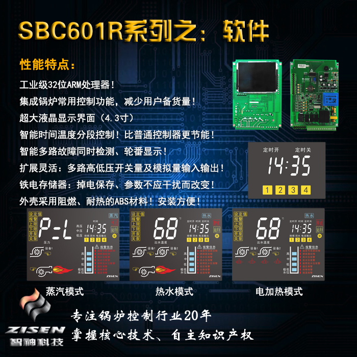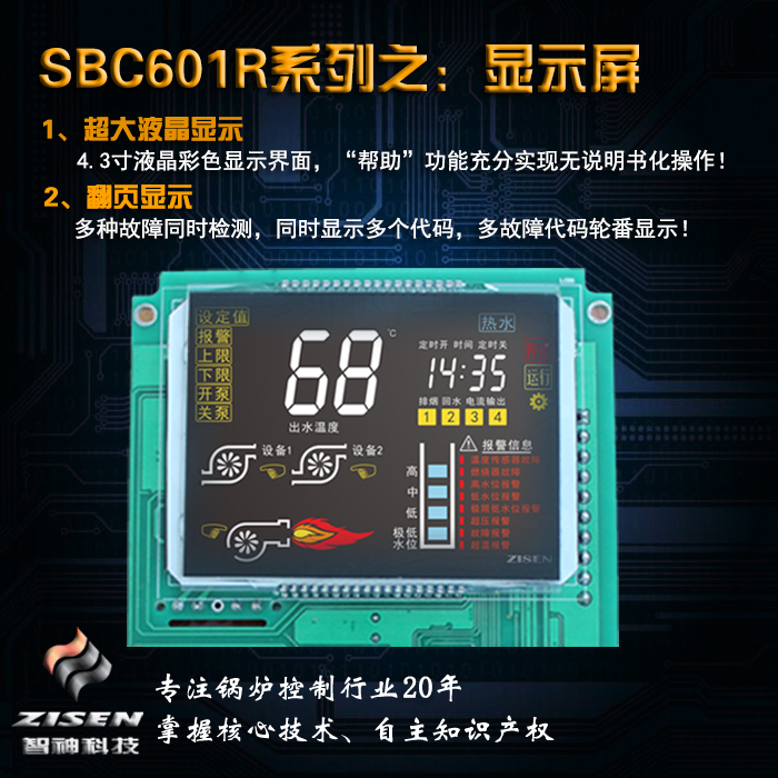 集成鍋爐常用控制功能; 人機界面采用4.3寸彩色液晶顯示屏,顯示清晰,操作簡單; 智能多路故障同時檢測與中文信息顯示,讓操作者更清楚當前鍋爐狀態; 集成標準MODBUS協議,方便與其它設備連接,可實現遠程控制! CPU采用工業級ARM32位處理器,可快速完成復雜的自控算法,輸出響應更快! 智能時間溫度分段控制,比普通控制器更節能! 多路高低壓開關量輸入、輸出和模擬量輸入、輸出,使擴展應用更靈活。 參數存儲采用鐵電存儲器,掉電保存十年,保證參數不會因干擾而改變! 可按用戶需求快速定制功能!